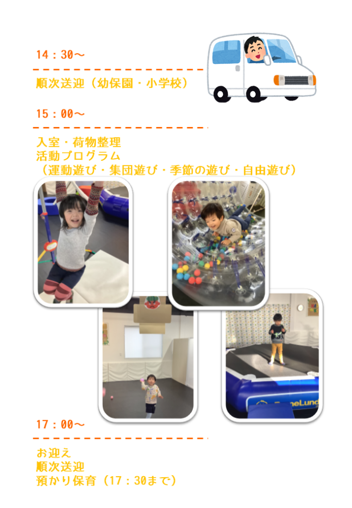 (帰り)17:30に事業所を出発。(人数・ご自宅の位置により前後します。)※上記に当てはまらない場合や、施設の体制上対応できない場合は、行き帰りともに保護者様で送迎をお願いしております。
